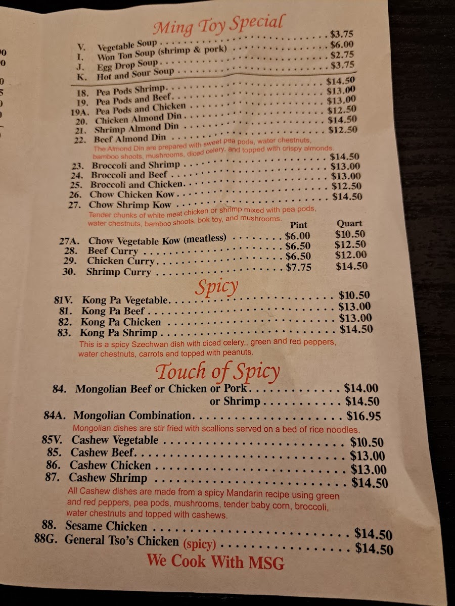 The dining atmosphere may have shifted to a carryout model post-COVID; however, the exquisite flavors that emerge from Ming Toy's kitchen remain as vibrant as ever. Their menu boasts a marvelous array of dishes that reflect traditional Chinese cuisine while catering to diverse tastes. From comforting soups to savory entrees, each dish is crafted to tantalize your taste buds.